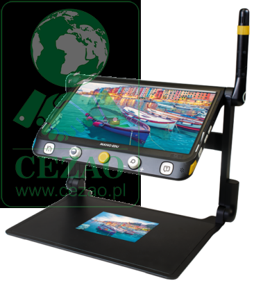 Przenośny powiększalnik MANO EDU to nowoczesne, składane urządzenie, wyposażone w dwie kamery (do powiększania z bliska i z daleka). Obie kamery oferują rozdzielczość Ultra HD 4K i mogą być wyświetlane jednocześnie na 12,5-calowym wyświetlaczu dotykowym dzięki funkcji podziału ekranu. Kąt widzenia wyświetlacza można regulować w sposób ciągły, a korekcja zniekształceń trapezowych wyrównuje zniekształcenia. Powiększalnik wyposażony jest w funkcję OCR – można przechwycić całą stronę A4 naciśnięciem jednego przycisku i odczytać ją na głos. Przechwytywanie wielu stron w dokumencie oraz możliwość kopiowania zewnętrznych plików graficznych i tekstowych z komputera do urządzenia sprawiają, że MANO EDU jest wielofunkcyjnym urządzeniem we wszystkich sytuacjach. Dostępny opcjonalnie ekran MultiView nie wymaga osobnego zasilania, można go zamontować nad głównym wyświetlaczem i zapewnia niezwykłą wygodę korzystania z kamery do dali. Specyfikacja wyświetlacz dotykowy 12,5″, rozdzielczość ekranu: 1920 x 1080 piksel, kamera Ultra HD 4K, rozdzielczość: 3840 x 2160 pikseli, wbudowana kamera do oglądania tekstu z daleka, (np. z tablicy w szkole), powiększenie w trybie dokumentu: ok. 1x – 60x (w zależności od kąta patrzenia), autofocus z opcją wyłączenia, tryb true color, 16 trybów koloru do wyboru, pełna funkcja A4 OCR i TTS (obsługuje 15 języków), funkcja zamrażania obrazu z możliwością zachowania w pamięci urządzenia, pamięć ok. 2 GB, obrazy można przenieść na kartę microSD, obsługiwane formaty plików: JPG, BMP, PNG, TXT, PDF, maskowanie linii , linijka; relokacja tekstu, funkcja wyszukiwania, podzielony ekran, zawiera przewodnik głosowy dla przycisków i menu, wymienna bateria Li-Ion, czas pracy do 5 h czas ładowania ok. 3 godziny, wymiary: po zainstalowaniu ok. 38x25x26cm, złożony ok. 38x4x26 cm, waga ok. 2400 gramów,