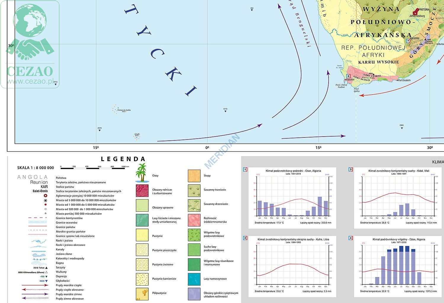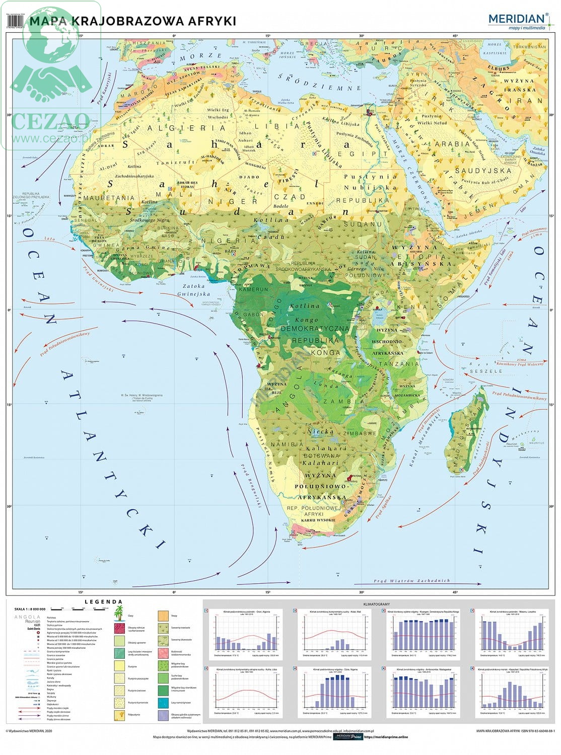Ścienna mapa szkolna do geografii w formie fototapety, przedstawiająca różnorodność krajobrazową Afryki. Na cieniowanym podkładzie (z efektem trójwymiarowym) ukazane jest rozmieszczenie najważniejszych typów krajobrazu tego kontynentu. W treści mapy znajdują się również następujące informacje: krainy geograficzne, szczyty, wulkany, punkty wysokościowe i głębokościowe, prądy morskie, granice i nazwy państw, stanów oraz stolice i największe miasta.