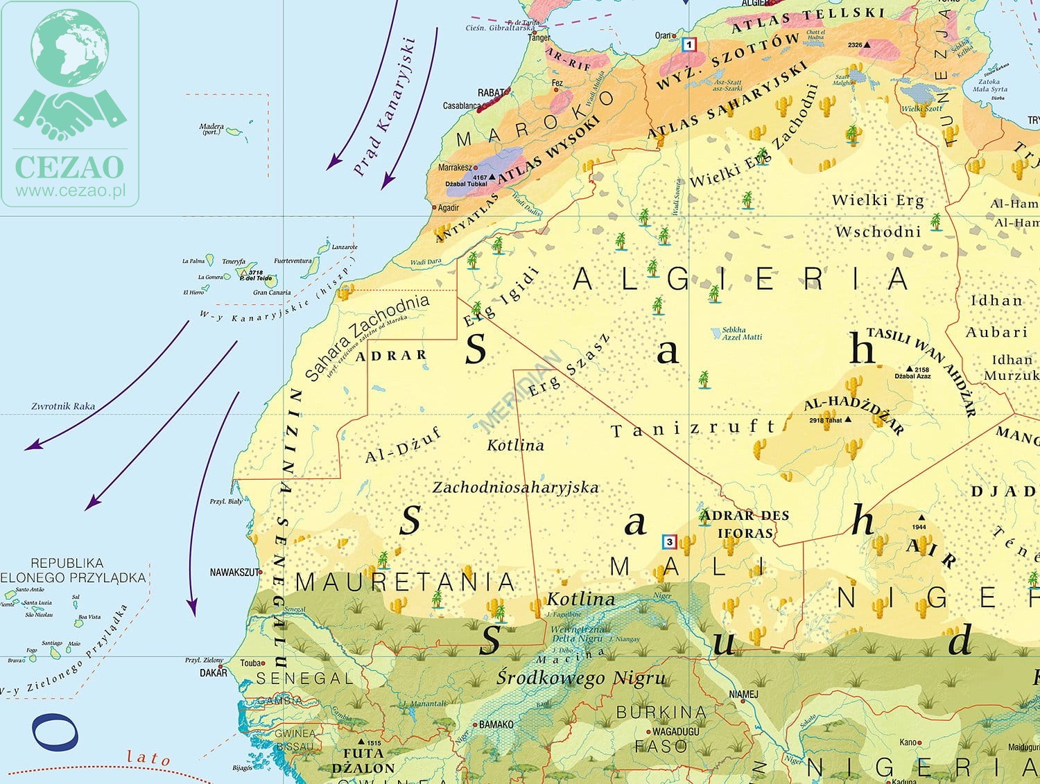 Ścienna mapa szkolna do geografii w formie fototapety, przedstawiająca różnorodność krajobrazową Afryki. Na cieniowanym podkładzie (z efektem trójwymiarowym) ukazane jest rozmieszczenie najważniejszych typów krajobrazu tego kontynentu. W treści mapy znajdują się również następujące informacje: krainy geograficzne, szczyty, wulkany, punkty wysokościowe i głębokościowe, prądy morskie, granice i nazwy państw, stanów oraz stolice i największe miasta.