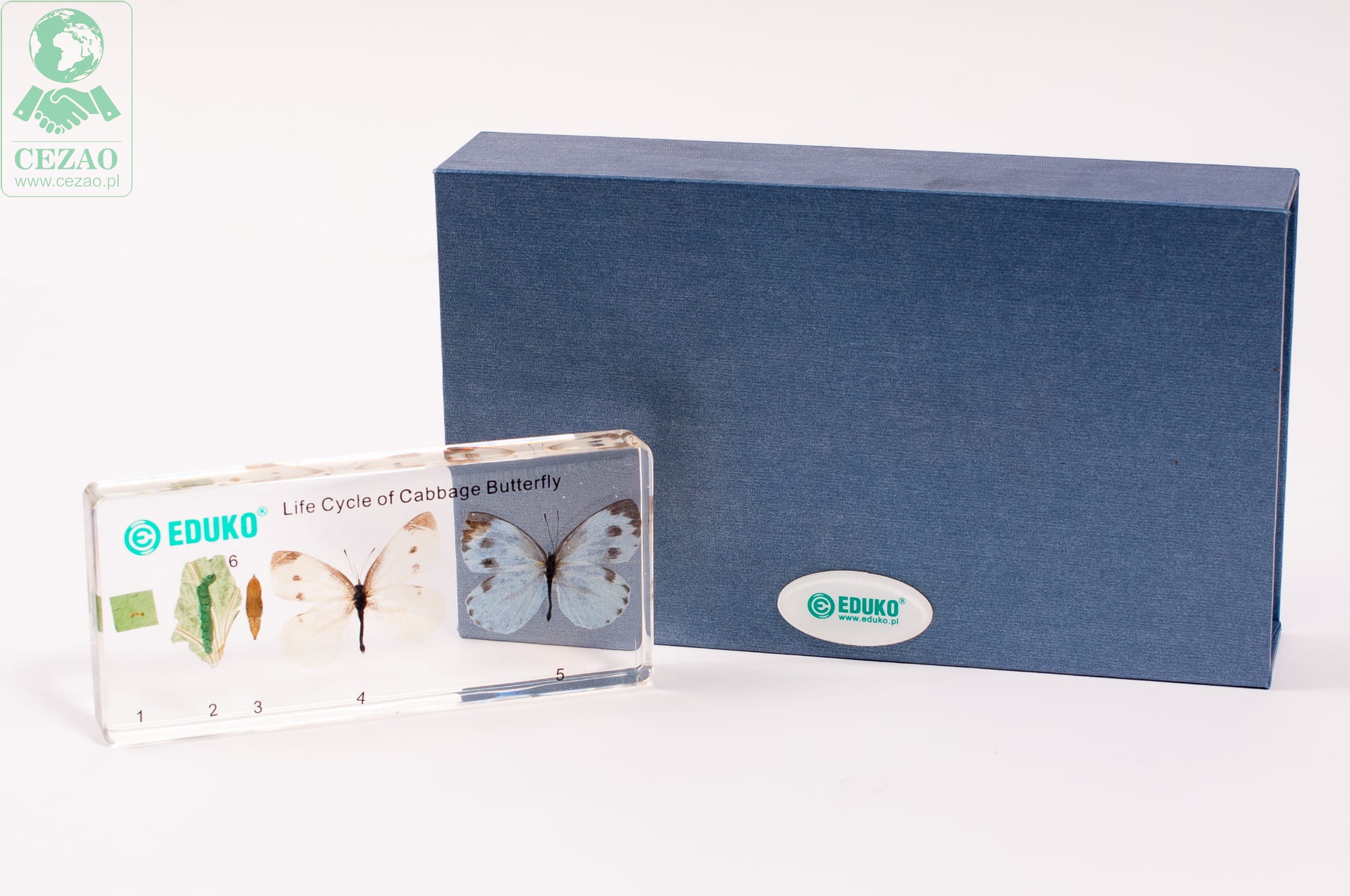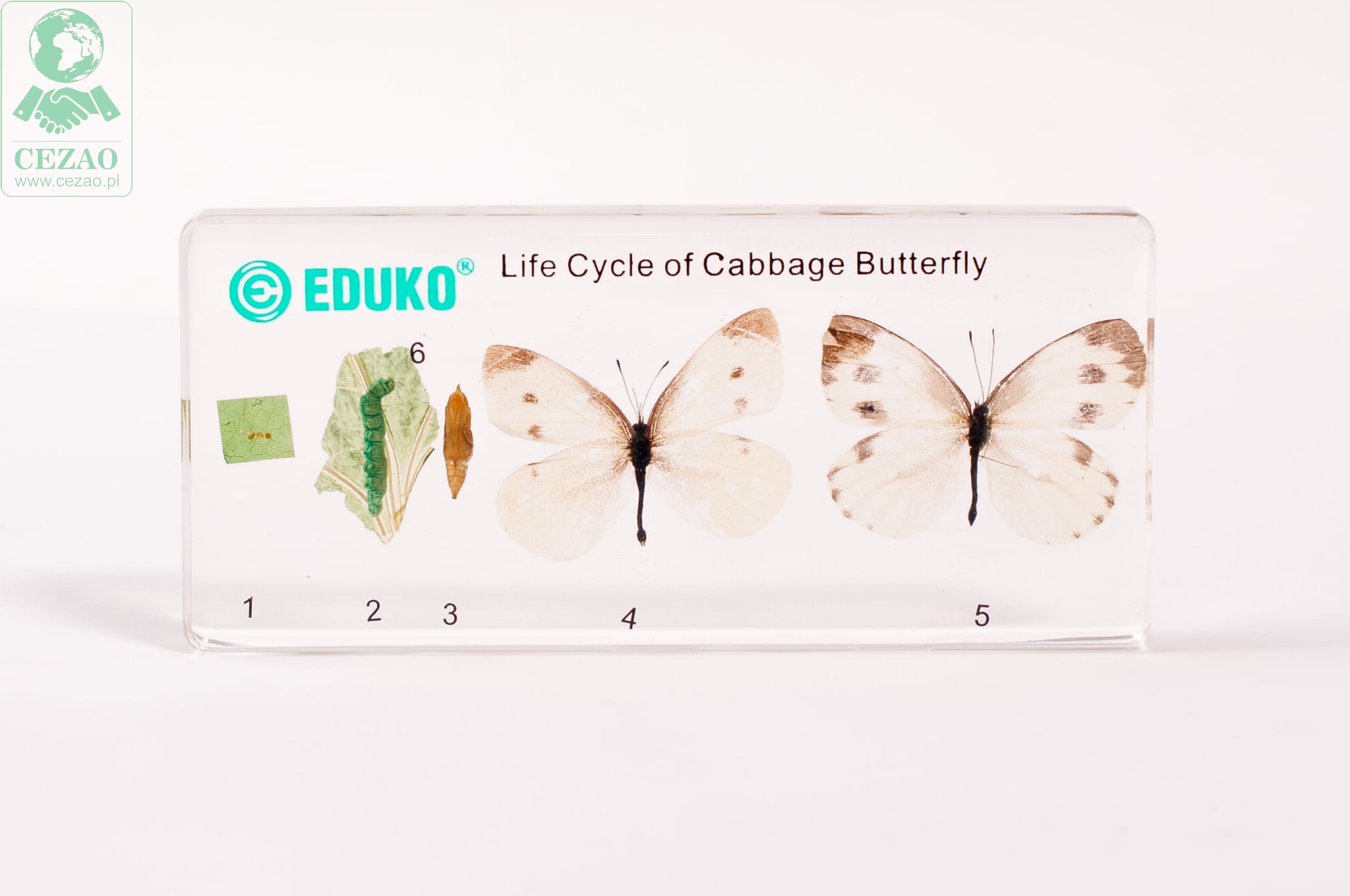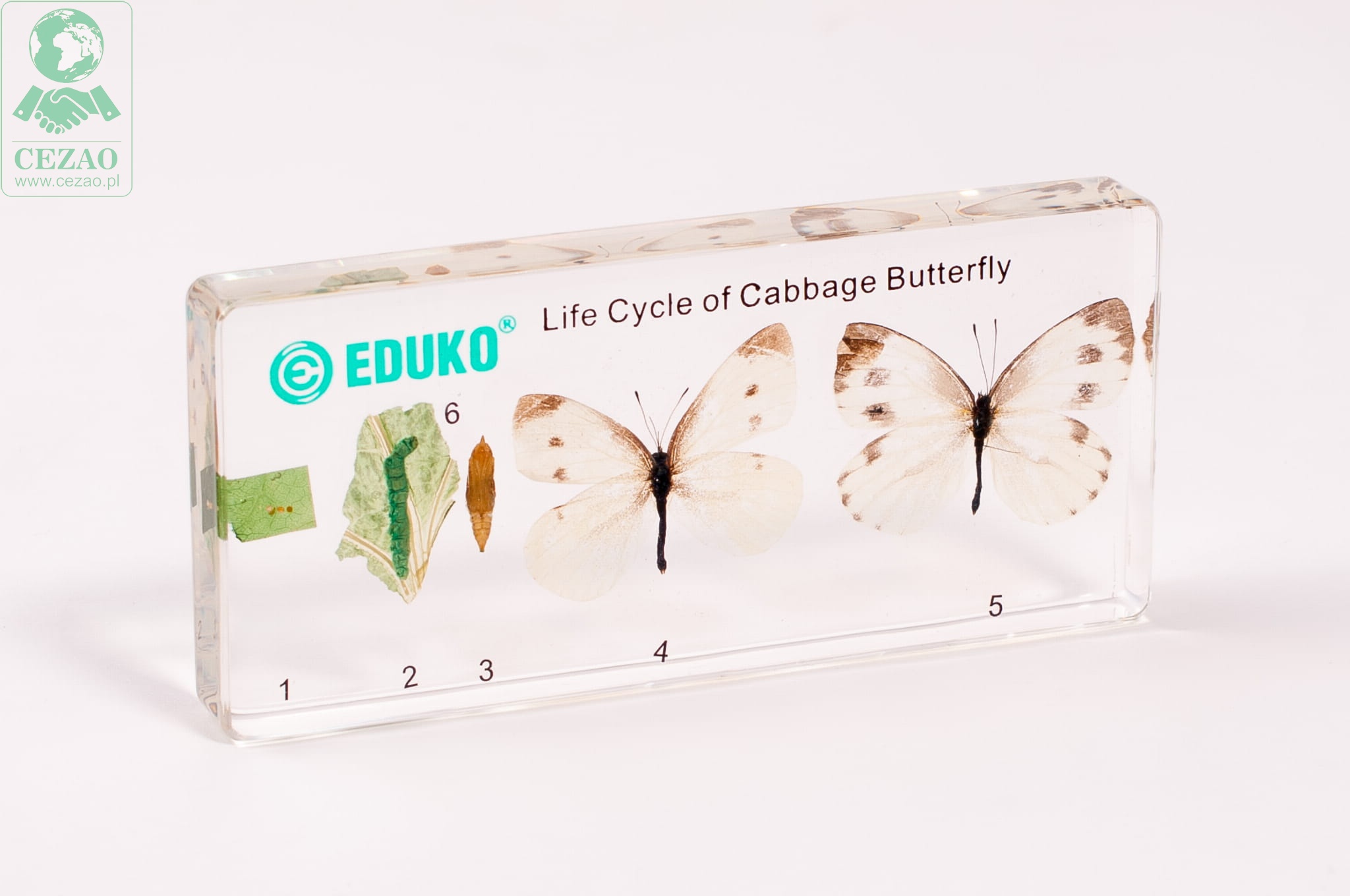 Preparat firmy EDUKO prezentuje poszczególne etapy rozwoju motyla na przykładzie bielinka kapustnika. Gatunek ten występuje na terenie Europy, basenu Morza Śródziemnego, Afryki Północnej oraz zachodniej Azji (aż do Himalajów). Przejrzyste tworzywo, w których zalane zostały liście pozwala na wnikliwą obserwację, jest bezpieczne dla ucznia i zwiększa trwałość preparatu.