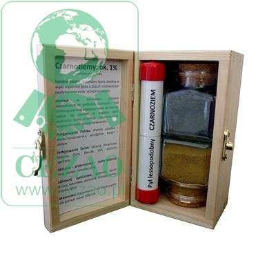 W drewnianej skrzyneczce znajdują się dwa osobne słoiczki o pojemności 150 ml. Jeden z próbką czarnoziemu oraz drugi ze skałą macierzystą. W tym wypadku jest to utwór lessowaty. Zestaw w prosty sposób obrazuje tworzywo z którego pod wpływem procesów glebotwórczych powstaje gleba. Obok słoiczków umieszczony jest wskaźnik pozwalający odróżnić obie wspomniane warstwy geologiczne.