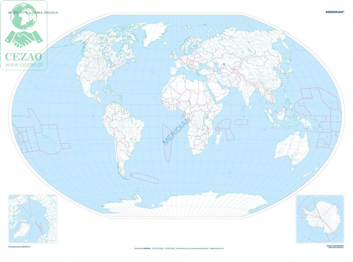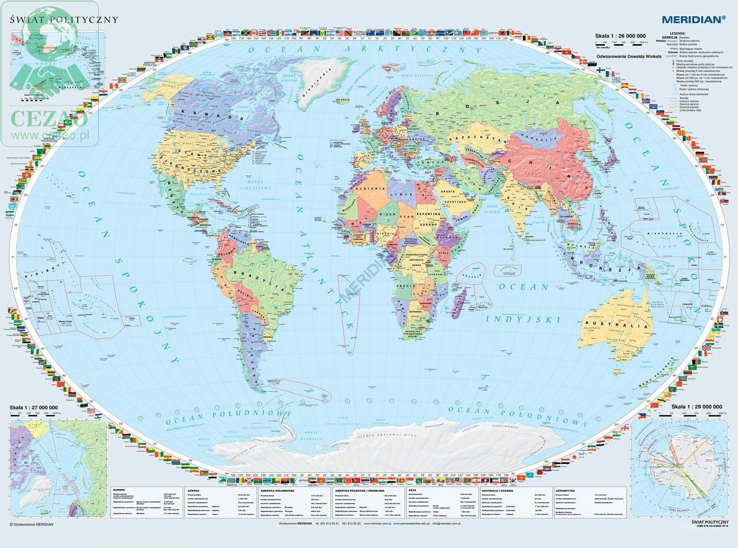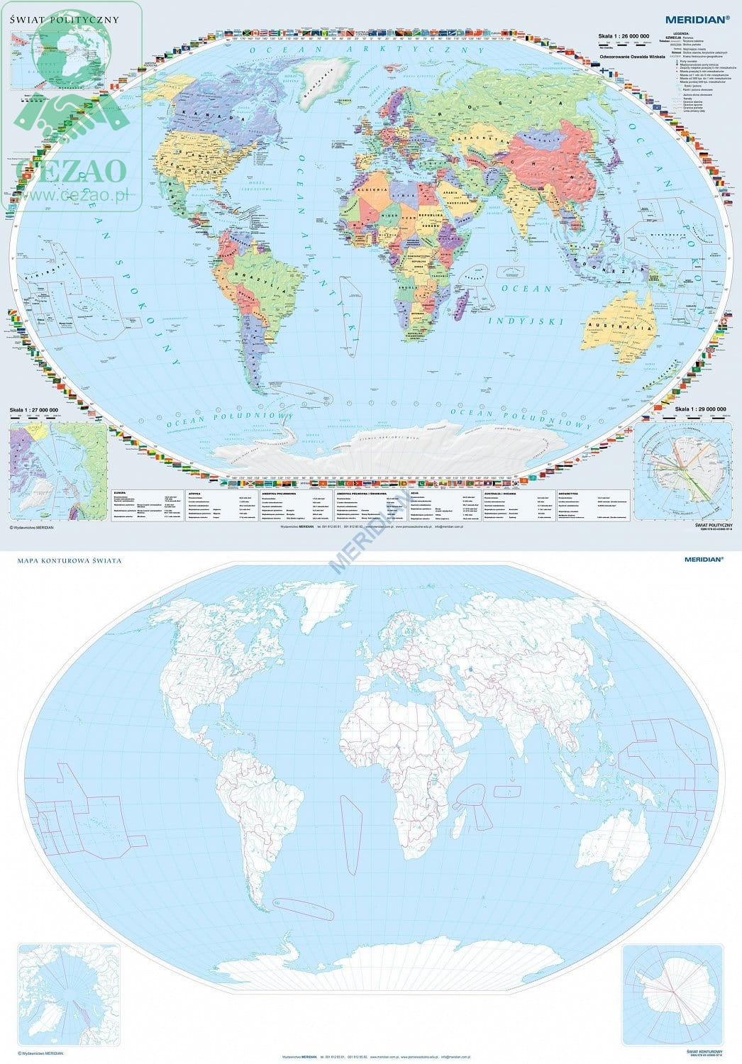 Na mapie zaznaczone są strefy czasowe jak również linia zmiany daty. Mapa wykonana jest najnowocześniejszą techniką pozwalającą na uzyskanie unikalnego efektu trójwymiarowego. W panelach dolnych wyszczególniono dane porównawcze kontynentów takie jak: powierzchnia, liczba mieszkańców, gęstość zaludnienie, największe i najludniejsze państwa oraz największe aglomeracje.
