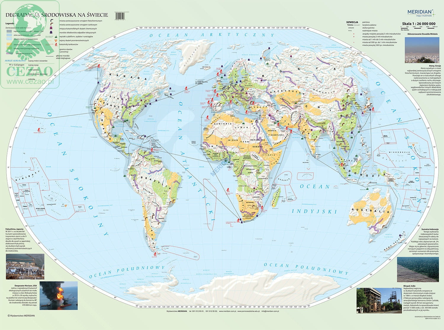 Mapa przedstawia aktualną problematykę wielostronnej degradacji biosfery spowodowanej działalnością człowieka. Dotyczy to zarówno zanieczyszczania atmosfery, hydrosfery jak i pustynnienia oraz wylesiania obszarów lądowych. Zaznaczone są także miasta o największym zanieczyszczeniu smogiem.