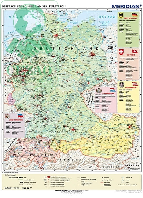 Ścienna mapa szkolna przedstawiająca kraje niemieckojęzyczne, Niemcy, Austrię, Szwajcarię i Liechtenstein oraz ich podział administracyjny. Mapa uwzględnia wewnętrzny podział Niemiec i Austrii na kraje związkowe (landy) oraz Szwajcarii na kantony. Dodatkowo w kartonach bocznych znajdują się podstawowe informacje statystyczne dotyczące poszczególnych krajów.