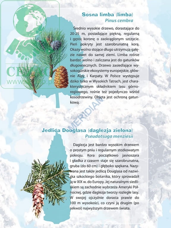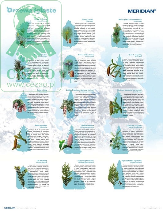 Ścienna plansza szkolna do biologii z cyklu bioróżnorodność Polski, przedstawiająca 15 gatunków drzew i krzewów iglastych rosnących dziko lub introdukowanych w Polsce. Metryczka każdego gatunku składa się z nazwy polskiej, nazwy łacińskiej, rysunku pokroju drzewa, powiększonego rysunku liści (szpilek) i owoców oraz opisu.