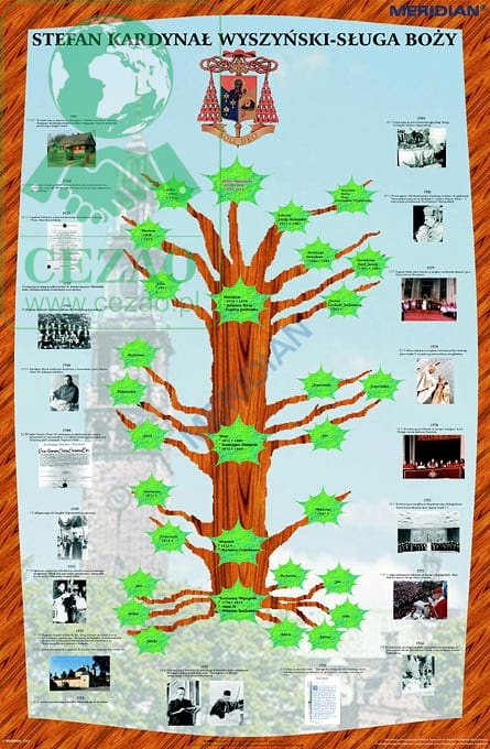 Ścienna plansza szkolna do religii, etyki, historii i WOS-u przedstawiająca drzewo genealogiczne i życiorys Kardynała Stefana Wyszyńskiego. Opracowana została we współpracy ze Stowarzyszeniem Przyjaciół Szkół im. Kardynała Stefana Wyszyńskiego.