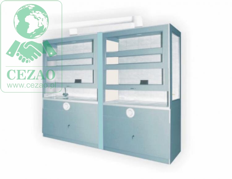 -górnej: komory manipulacyjnej oszklonej szybami hartowanymi wyłożonej płytkami ceramicznymi kwasoodpornymi do wysokości sufitu. Komora wyposażona jest w zlew polipropylenowy, baterie, dolny szyber instalacji wyciągowej, zawór gazowy.