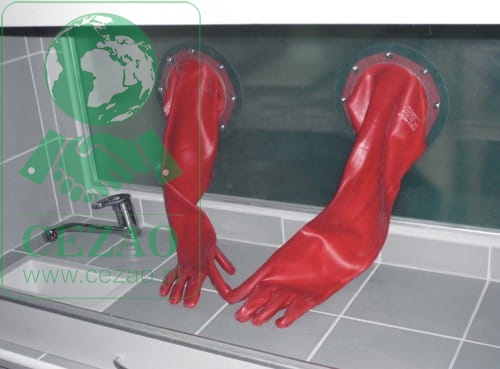 -górnej: komory manipulacyjnej oszklonej szybami hartowanymi wyłożonej płytkami ceramicznymi kwasoodpornymi do wysokości sufitu. Komora wyposażona jest w zlew polipropylenowy, baterie, dolny szyber instalacji wyciągowej, zawór gazowy.