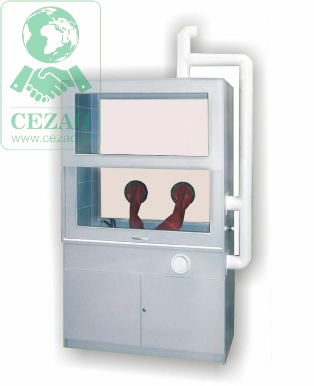 -górnej: komory manipulacyjnej oszklonej szybami hartowanymi wyłożonej płytkami ceramicznymi kwasoodpornymi do wysokości sufitu. Komora wyposażona jest w zlew polipropylenowy, baterie, dolny szyber instalacji wyciągowej, zawór gazowy.
