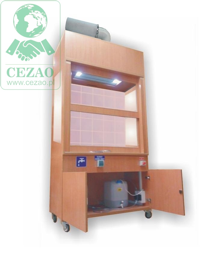 -dolnej: szafki dwudrzwiowej z zamontowanym syfonem, dygestorium posiada w wyposażeniu dwa zbiorniki na wodę czystą i ścieki, 20l każdy, pompe wodną 24V, włącznik pompy na panelu zewnętrznym dygestorium, kółka obrotowe z hamulcem.
