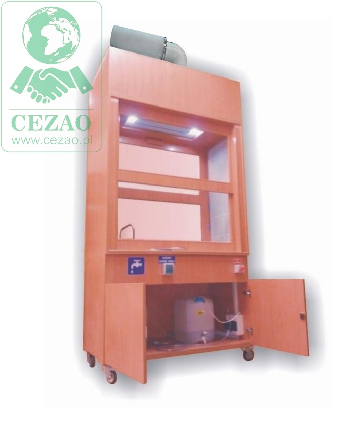 -dolnej: szafki dwudrzwiowej z zamontowanym syfonem, dygestorium posiada w wyposażeniu dwa zbiorniki na wodę (czystą i ścieki), 20l każdy, pompe wodną 24V, włącznik pompy na panelu zewnetrznymn digestorium, kółka obrotowe z hamulcem.