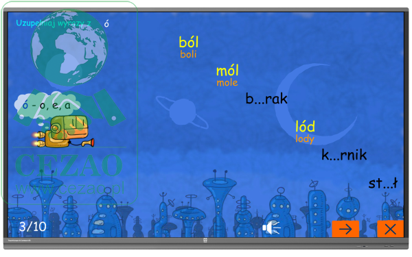 Aplikacja oferuje 3 zestawy gier wspomagających terapię uczniów: