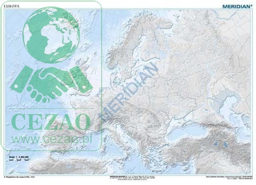Ścienna, ćwiczeniowa mapa szkolna przedstawiająca ukształtowanie powierzchni Europy. W treści mapy oprócz przebiegów poziomic znajduje się warstwa hydrografii oraz granic państwowych w języku hiszpańskim.