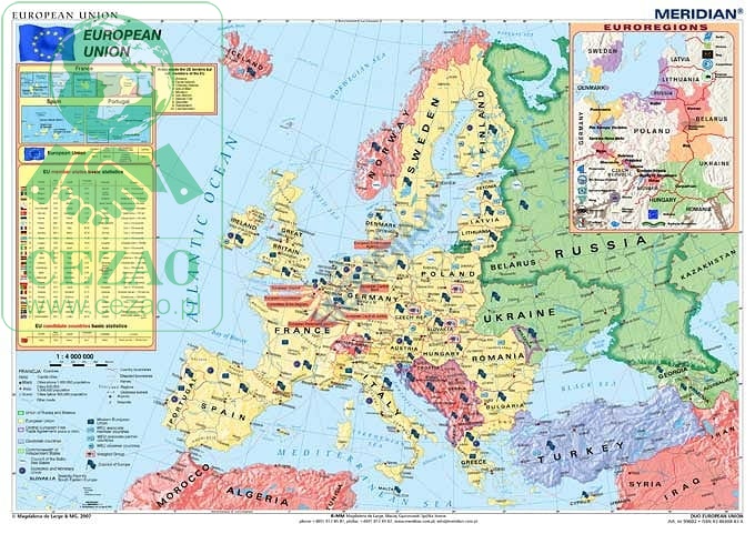 Kompendium wiedzy kartograficzno - statystycznej i informacji ogólnych na temat Unii Europejskiej. Aktualny na 2010 r. podział geopolityczny Europy widziany przez pryzmat procesów zjednoczeniowych z zaznaczeniem najważniejszych Unijnych instytucji oraz Państw: Rady Europy, Grupy Wyszehradzkiej, Obserwatorów UZE, Partnerów Stowarzyszonych UZE, Rada Państw Morza Bałtyckiego, itp.