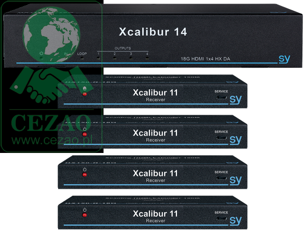 Zestaw jest dostarczany z 4 odbiornikami Xcalibur 11. Xcalibur 14 posiada kluczowe funkcje, takie jak HDMI Loop-out, dwukierunkowe IR, RS232 Pass Through, RS232 Control, Down Scaling, Test Pattern Generator, Balanced Audio & Digital Audio De-embed Outputs, VKA, PoC, zarządzanie HDCP i EDID. Ponadto 4 dołączone odbiorniki Xcalibur 11 posiadają analogowe wyjście audio de-embed.