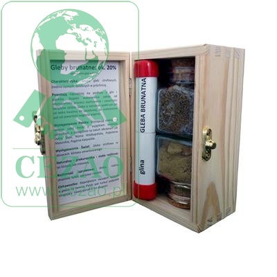 W drewnianej skrzyneczce znajdują się dwa osobne słoiczki o pojemności ok. 100 ml z próbką gleby brunatnej oraz drugi ze skałą macierzystą. W tym wypadku jest to – glina. Obok słoiczków umieszczony jest słupek wskaźnikowy pozwalający odróżnić opisane warstwy geologiczne.
