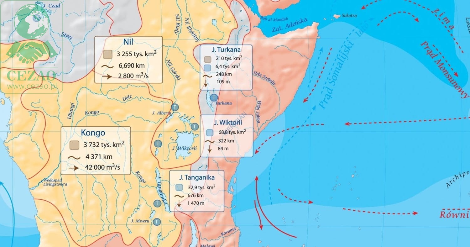 Na mapie oznaczone zostały również typy najważniejszych jezior oraz ich geneza. Główne rzeki oraz większe jeziora opisane są tabliczkami zawierającymi istotne i ciekawe informacje, takie jak: powierzchnia dorzecza, długość rzeki, średni przepływ przy ujściu, ilość niesionego osadu dla rzek oraz powierzchnia i rozciągłość zbiornika, maksymalna głębokość, powierzchnia dorzecza dla jezior.
