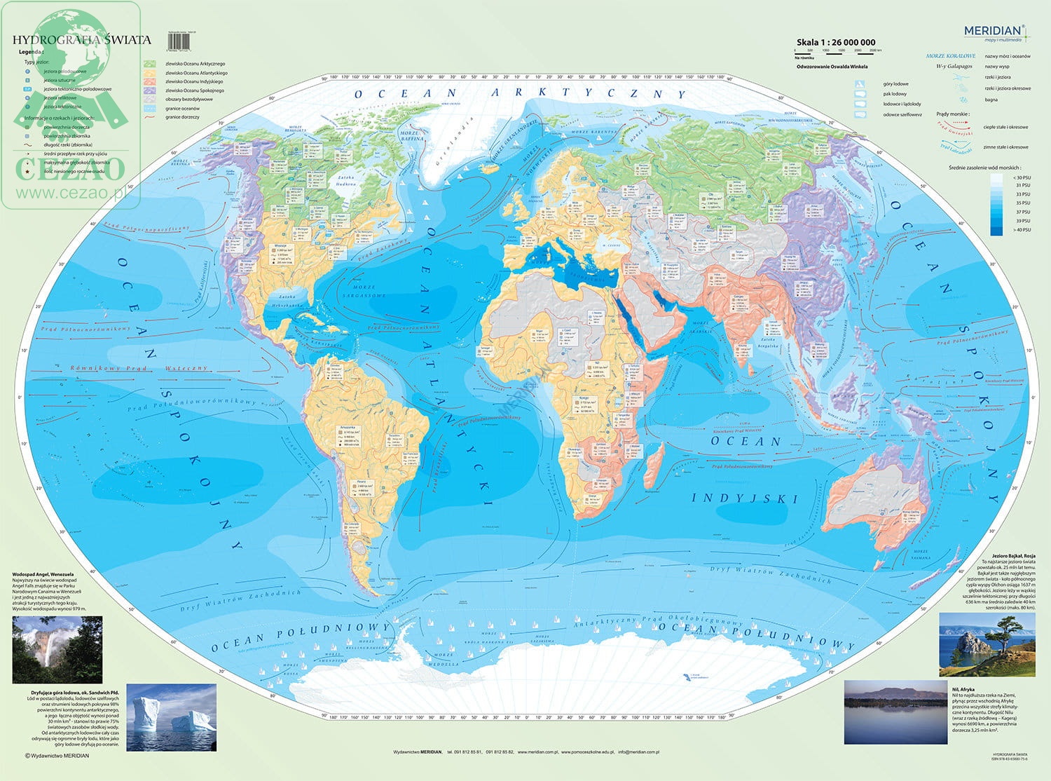 Ścienna mapa szkolna przedstawia najważniejsze zagadnienia dotyczące stosunków wodnych w obrębie wód powierzchniowych Ziemi: zlewiska oceanów i dorzecza, obszary bezodpływowe, średnie zasolenie wód morskich (PSU) i prądy powierzchniowe. Pokazane są także różne formy wody słodkiej związanej w obszarach polarnych: lodowce i lądolody, lodowce szelfowe, pak lodowy i góry lodowe.