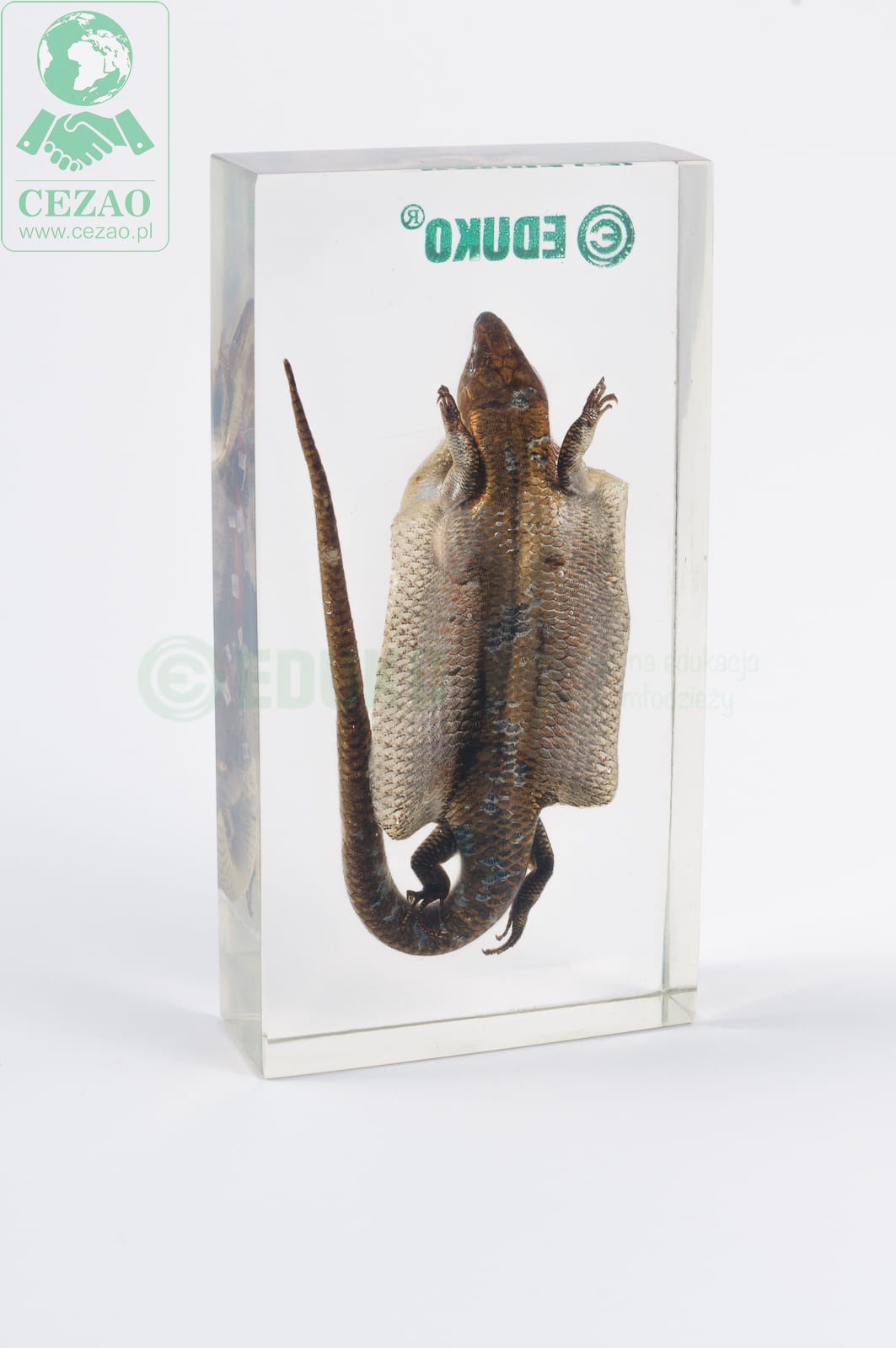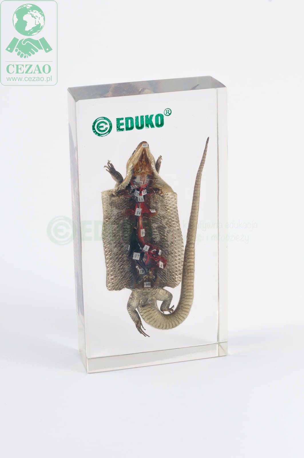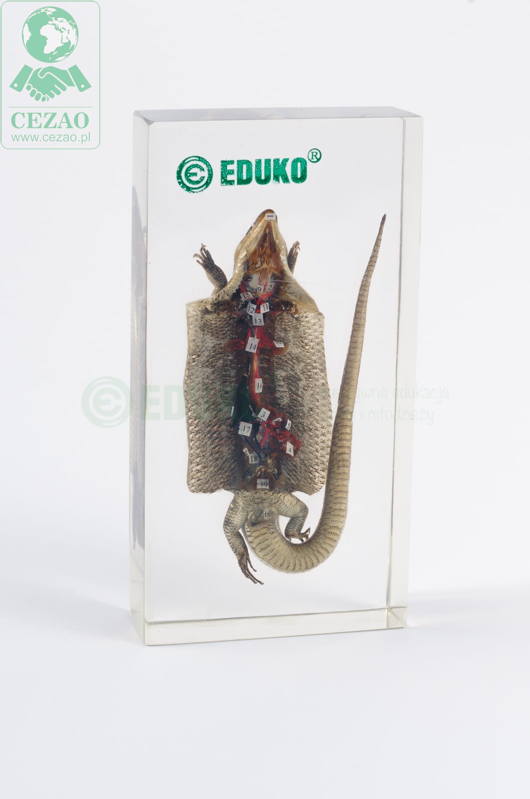 Zalana w przejrzystej pleksi dysekcja gada na przykładzie jaszczurki jest cenną pomocą dydkatyczną na poziomie szkoły średniej. Utrwalona w tworzywie dysekcja pozwala uczniom zapoznać się z położeniem i wyglądem poszczególnych narządów. Dla ułatwienia nauki na preparacie oznaczono numerami: język, przełyk, żołądek, wątorobę, trzustkę, jelita: cienkie i grube, kloakę, tchawicę, płuco, nerkę, moczowód, szczegóły anatomiczne serca: komorę, lewy i prawy przedsionek, łuk aorty, aortę szyjną i grzbietową i żyłę. Do każdego preparatu dołączony jest opis oznaczonych narządów.