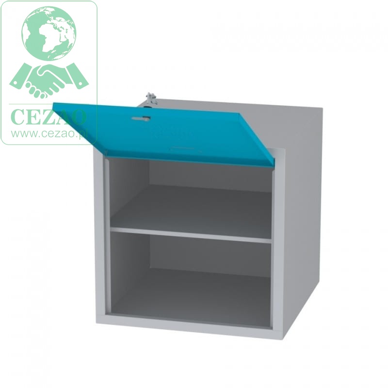 - Zamknięcie: drzwi otwierane od góry, zamykane zamkiem cylindrycznym w systemie klucza master