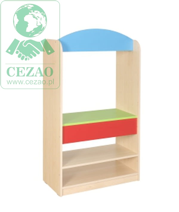 Wykonany z płyty laminowanej z kolorowymi elementami.
