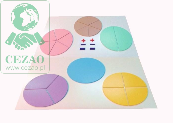 Zestaw kół wykonanych ze sklejki 8 mm, o średnicy 40 cm, podzielonych odpowiednio na 2, 3, 4, 5, 6 części oraz jedno całe koło. Każde koło w innym kolorze. Zestaw zawiera dodatkowo znaki +, -, = (po dwie sztuki). Wszystkie elementy zestawu wuposażone są w magnesy.