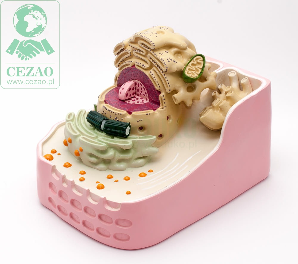 Model prezentuje szczegółowo budowę komórki roślinnej w pełnym przekroju, dzięki któremu wyeksponowane zostały: ściana komórkowa, jądro komórkowe (widoczne nici DNA) z jąderkiem, siateczki śródplazmatyczne, aparat Golgiego, mitochondria, chloroplasty, centriole i wodniczki. Aby ułatwić naukę, każdy z elementów struktur komórkowej oznaczony jest kontrastowym kolorem.