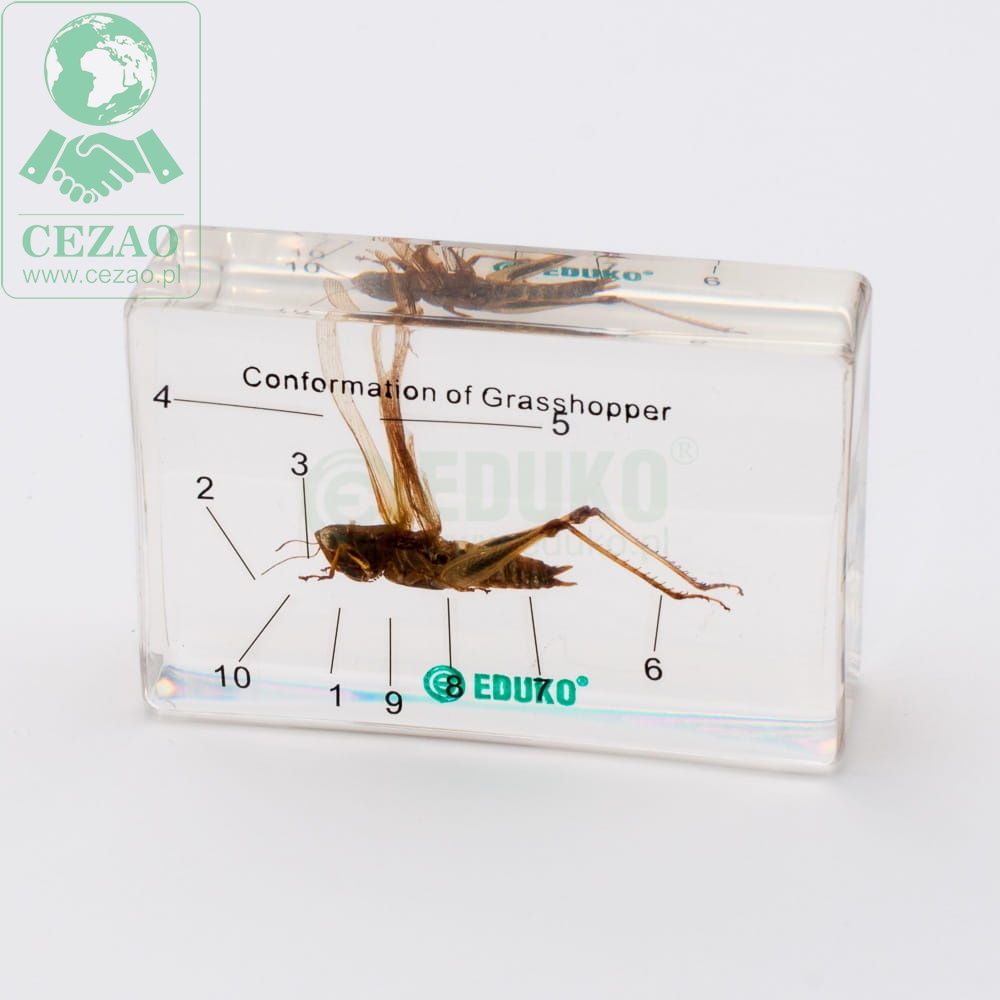 Preparat makroskopowy firmy EDUKO prezentuje okaz dużego szarańczaka spreparowanego w taki sposób, aby uwidocznić wszystkie części ciała. Dzięki dużym rozmiarom spreparowanego owada z łatwością obserwować można m.in. głowę z krótkimi czułkami i oczami złożonymi, dwie pary skrzydeł, odnóża ze szczególnie charakterystycznym tylnim odnóżem skocznym z silnym udem i długim goleniem. Produkt ten pomaga uczniom klas przyrodniczych i biologicznych w nauce nazewnictwa poszczególnych części ciała owadów. Wymiary pleksi: 8,5x5,5x2cm