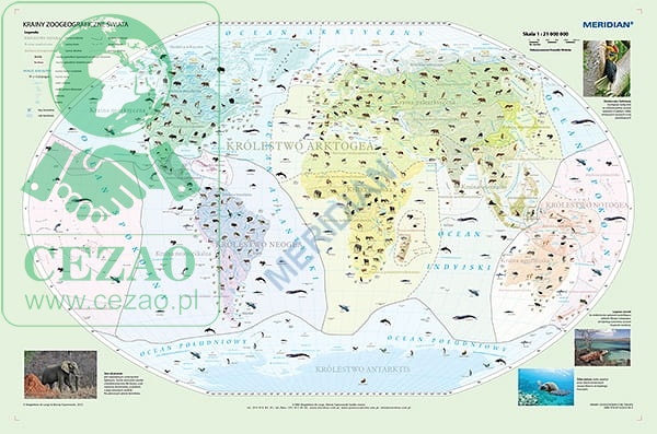 Bogato ilustrowana ścienna mapa szkolna przedstawiająca podział świata zwierzęcego na królestwa, krainy i dzielnice zoogeograficzne. Każdy obszar przypisane ma najbardziej charakterystyczne dla niego gatunki zwierząt, z wyszczególnionymi gatunkami endemicznymi.