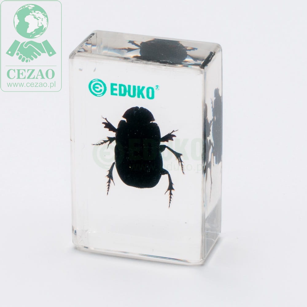 Preparat zawiera okaz chrząszcza z gatunku Catharsius molossus. Chrząszcz ten należy do podrodziny Scarabaeinae (rodzina poświętnikowate) i może osiągnąć długość około 45mm. Dzięki przezroczystemu tworzywu można obserwować typowe cechy tego gatunku: jednolicie czarną barwę, pokrywy skrzydłowe pokryte drobnymi prążkami, wypukłe przedplecze z parą ostro zakończonych guzów oraz szeroką głowę o charakterystycznym kształcie, na której u samców odnaleźć można krótki róg. Catharsius molossus jest jednym z najbardziej rozpowszechnionych gatunków Azji. Jest to ciekawy okaz kolekcjonerski oraz doskonała pomoc edukacyjna do nauki obserwacji, analizy i wyciągania wniosków na temat budowy i przystosowania owadów koprofagicznych.