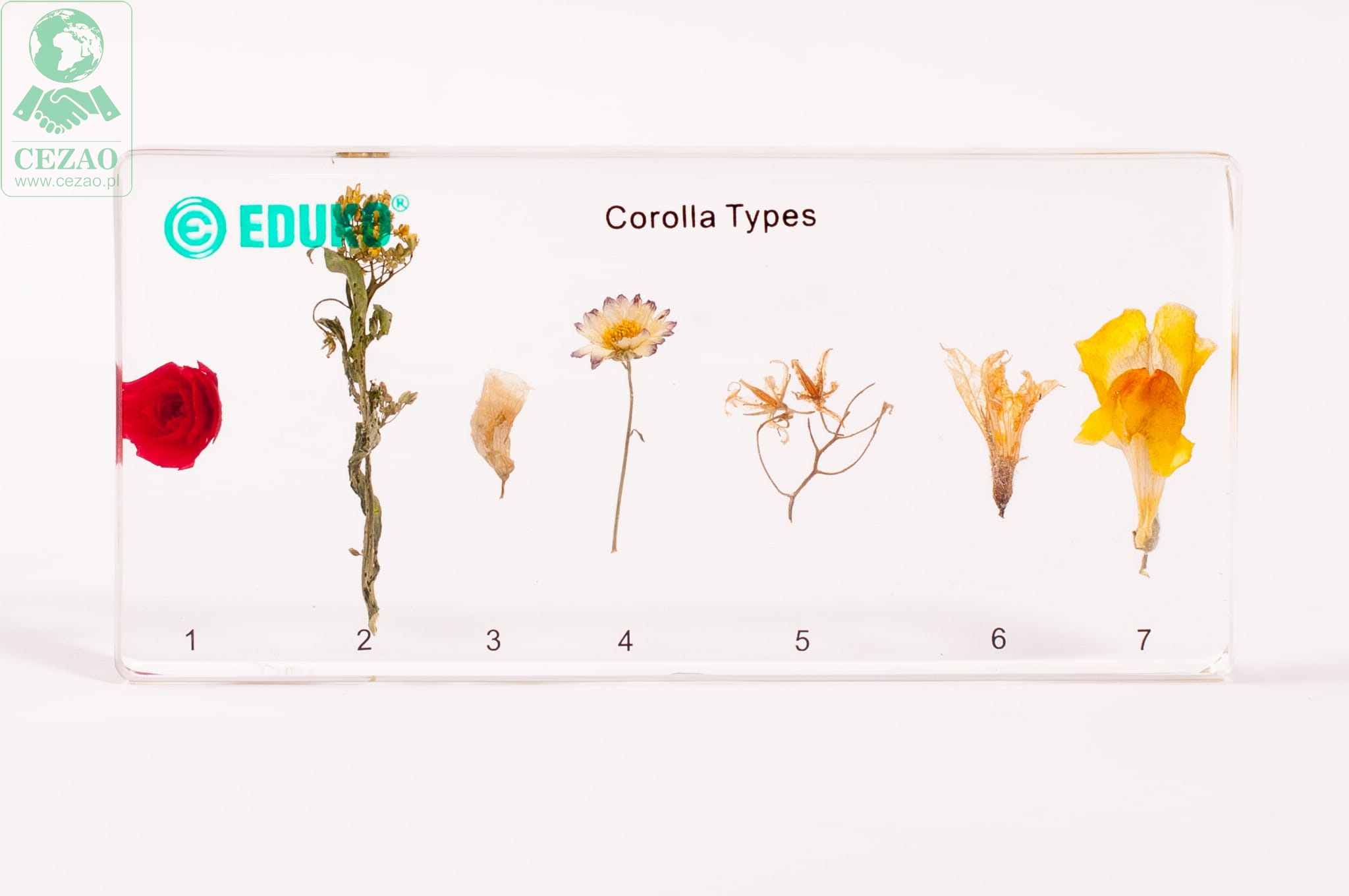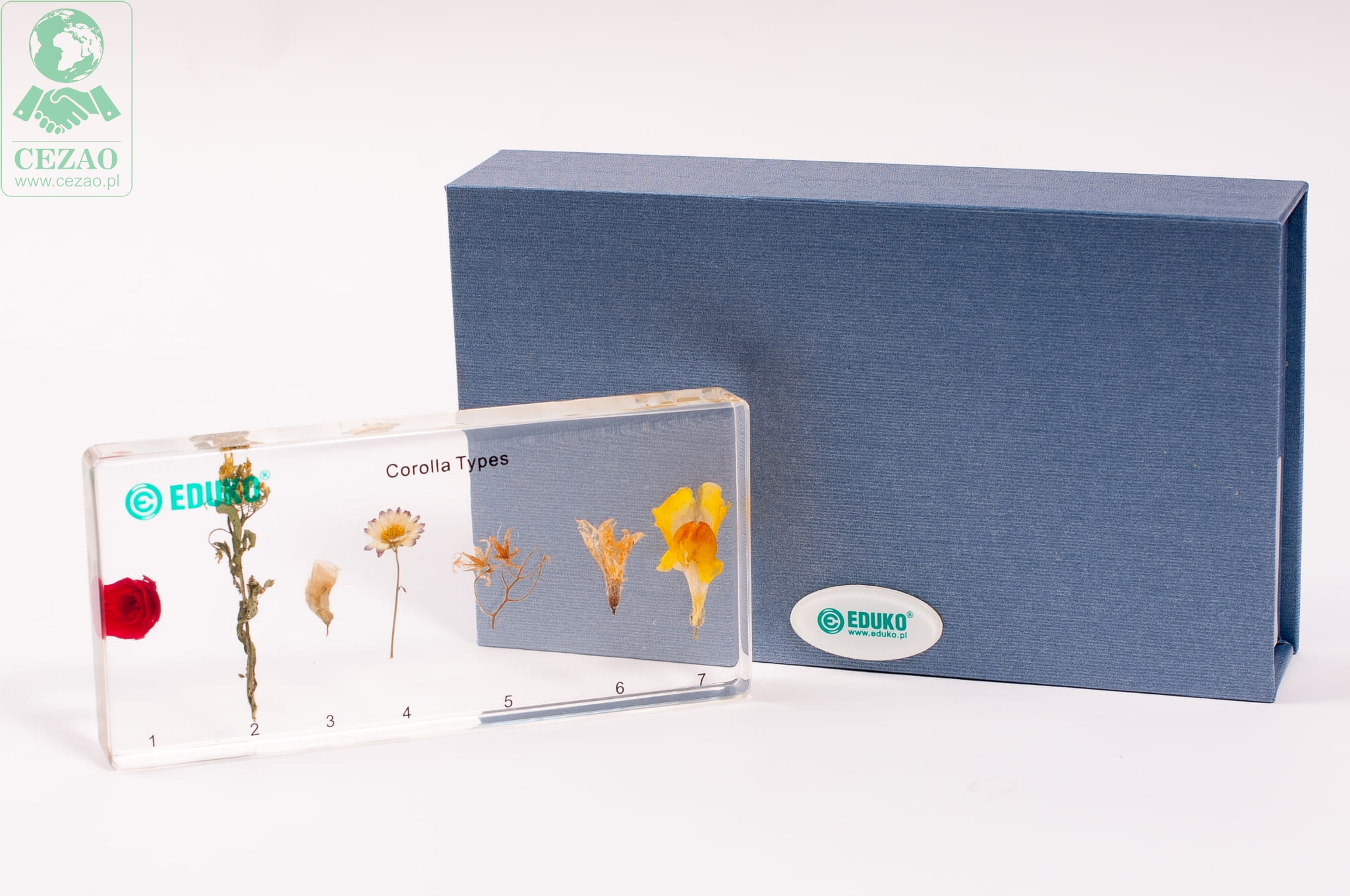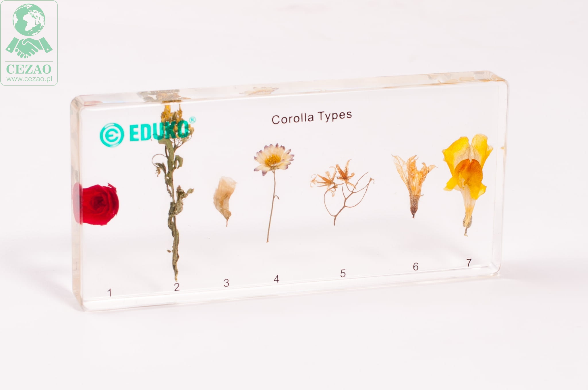 Preparat zawiera 7 okazów kwiatów różnych rodzin zatopionych w pleksi. Przejrzyste tworzywo, w których zalane zostały kwiaty pozwala na wnikliwą obserwację, jest bezpieczne dla ucznia i zwiększa trwałość preparatu. Jest to doskonała pomoc edukacyjna, która umożliwia zapoznanie ucznia z różnorodnością kształtów okwiatu oraz kwiatami typowymi dla rodzin: