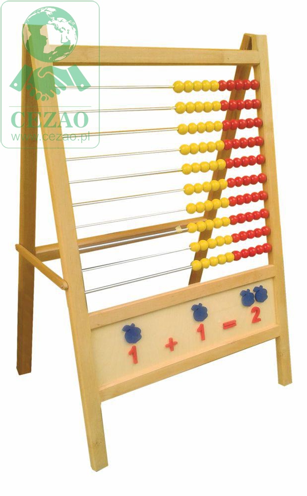 Wykonane jako podwójne skrzydło z ramy drewnianej w pastelowych kolorach. Tablica z działaniem matematycznym uatrakcyjnia wygląd liczydła. Na prętach umieszczone są zółto-czerwone kulki drewniane pełne o średnicy 34 mm.