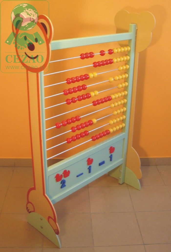 Wykonane jako pojedyncze skrzydło z ramy drewnianej w pastelowych kolorach. Na prętach umieszczone są zółto-czerwone kulki drewniane o pełne średnicy 34 mm. W dolnej części umieszczone jest działanie matematyczne z wycinanek drewnianych, a na ramionach kolorowe zwierzątka. Po bokach liczydła umiejscowione są ozdobne misie ze sklejki, które uatrakcyjniają wizerunek liczydła. Bajkowy wygląd zachęca do korzystania z liczydła.