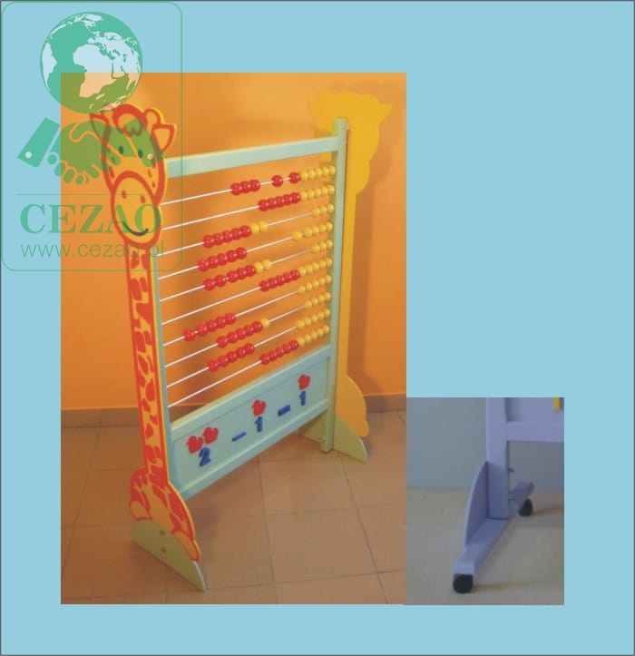 Wykonane jako pojedyncze skrzydło z ramy drewnianej w pastelowych kolorach. Na prętach umieszczone są żółto-czerwone kulki drewniane pełne o średnicy 34 mm. W dolnej części umieszczone jest działanie matematyczne z wycinanek drewnianych, a na ramionach kolorowe zwierzątka. Po bokach liczydła umiejscowione są ozdobne żyrafy ze sklejki, które uatrakcyjniają wizerunek liczydła. Kółka obrotowe umożliwiają przesuwanie liczydła. Bajkowy wygląd zachęca do korzystania z liczydła.