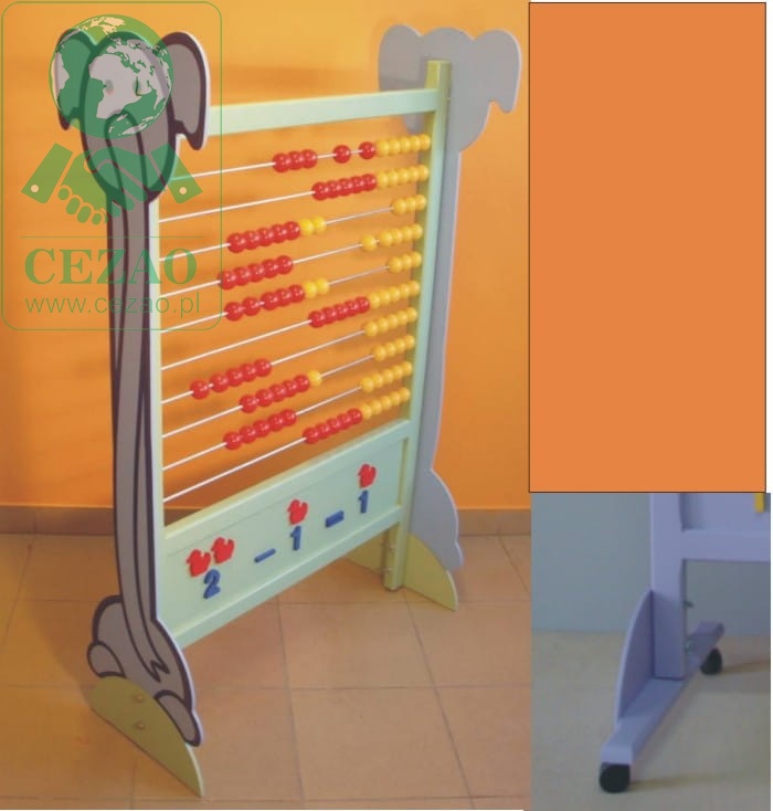 Wykonane jako pojedyncze skrzydło z ramy drewnianej w pastelowych kolorach. Na prętach umieszczone są żółto-czerwone kulki drewniane pełne o średnicy 34 mm. W dolnej części umieszczone jest działanie matematyczne z wycinanek drewnianych, a na ramionach kolorowe zwierzątka. Po bokach liczydła umiejscowione są ozdobne słonie ze sklejki, które uatrakcyjniają wizerunek liczydła. Bajkowy wygląd zachęca do korzystania z liczydła. Kółka obrotowe umożliwiają przesuwanie liczydła.