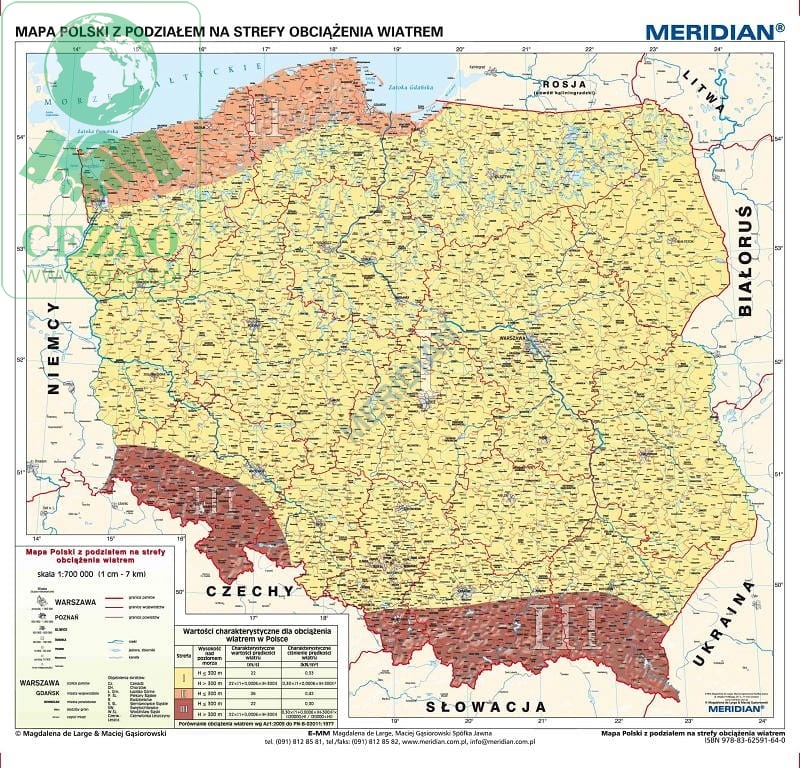 Ścienna mapa przedstawiająca podział Polski na strefy obciążenia wiatrem oraz wartości charakterystyczne dla obciążenia wiatrem zgodnie z aktualizowanym aneksem do polskiej normy PN-77/B-02011/Az1. Granice stref przedstawione są na tle przestrzennego odwzorowania ukształtowania powierzchni ziemi. W treści mapy zawarto trzystopniowy podział na województwa, powiaty i gminy.
