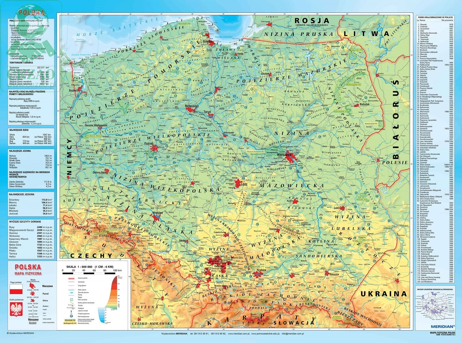 Ścienna mapa szkolna przedstawiająca ukształtowanie powierzchni oraz krainy geograficzne Polski. Mapę fizyczną Polski wzbogacono dodatkowo o informacje na temat ochrony środowiska. Umieszczone są na niej parki narodowe, parki krajobrazowe, ostoje wodno-błotne objęte konwencją Ramsarską oraz rezerwaty biosfery wpisane na światową listę UNESCO. Mapa wykonana jest najnowocześniejszą techniką pozwalającą na uzyskanie unikalnego efektu trójwymiarowego. Po obu stronach mapy rozmieszczone są uzupełniające informacje i opisy oraz mapka obszarów zagrożenia ekologicznego.