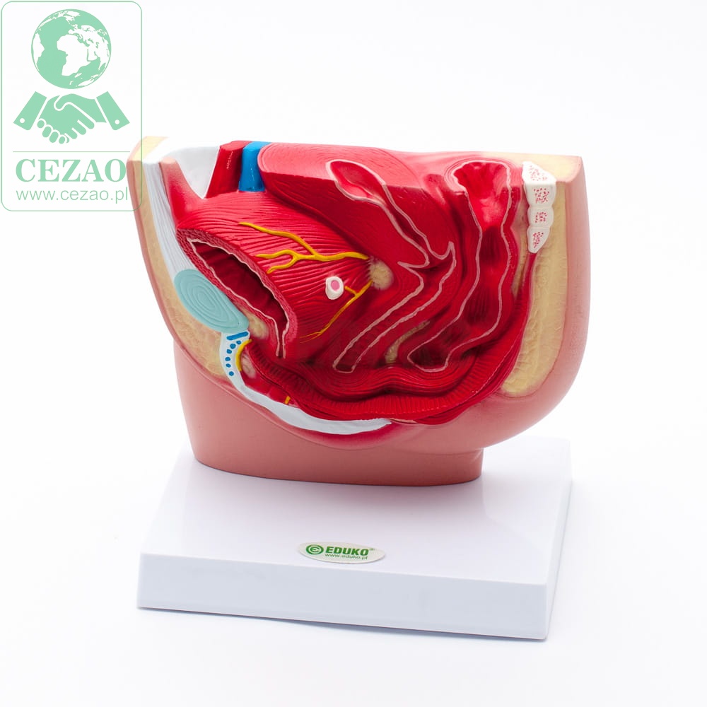 Model firmy EDUKO przedstawia przekrój wzdłuż płaszczyzny środkowej żeńskiej miednicy i pokazuje wszystkie najważniejsze jej struktury. Dzięki zastosowaniu kontrastowych kolorów pomoc dydaktyczna jest czytelna i pozwala na łatwe odnalezienie m.in. macicy, pochwy, pęcherza moczowego i cewki moczowej, warg sromowych, spojenia łonowego i odbytnicy.
