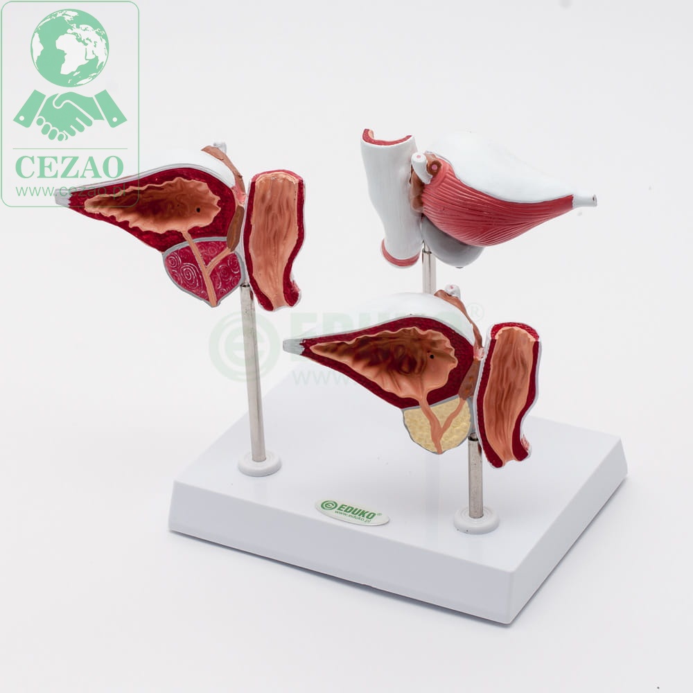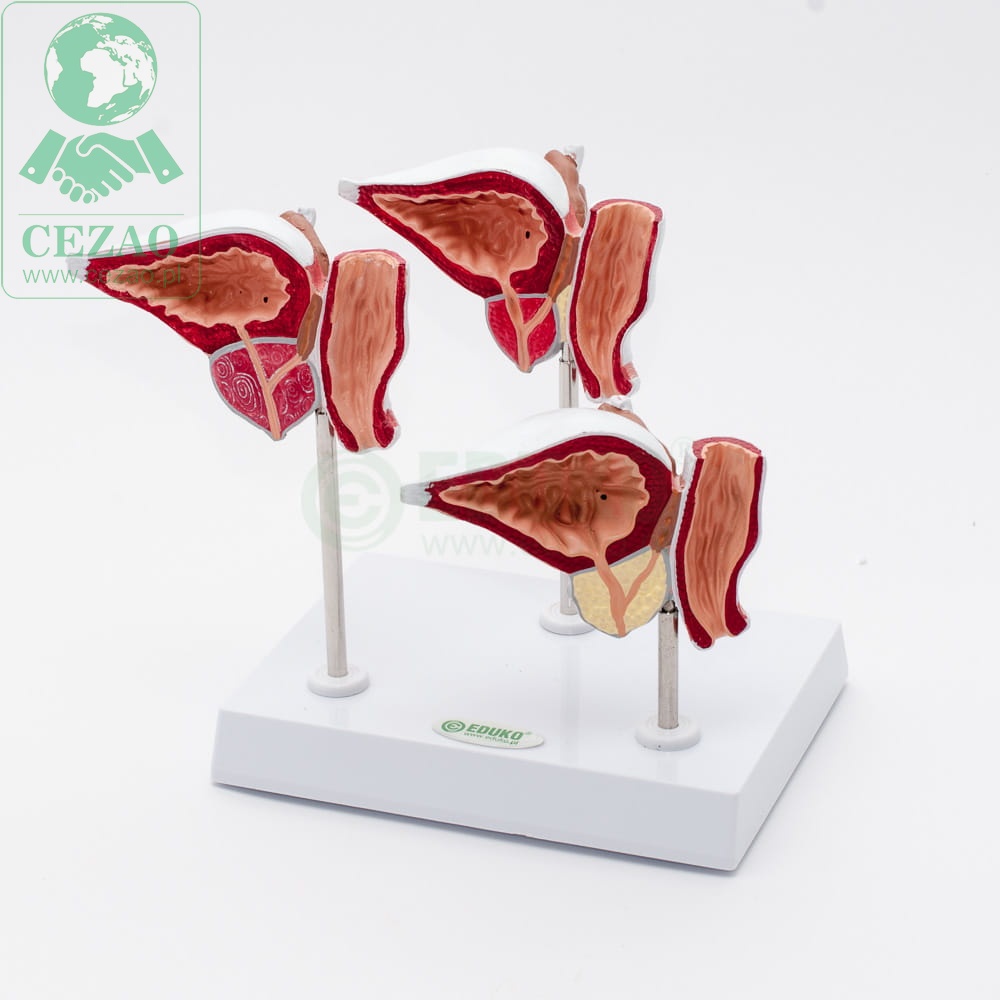 Trzy modele na podstawie przedstawiające przekrój przez prostatę, pęcherz oraz cewkę moczową ilustrują kolejne etapy rozrostu prostaty.