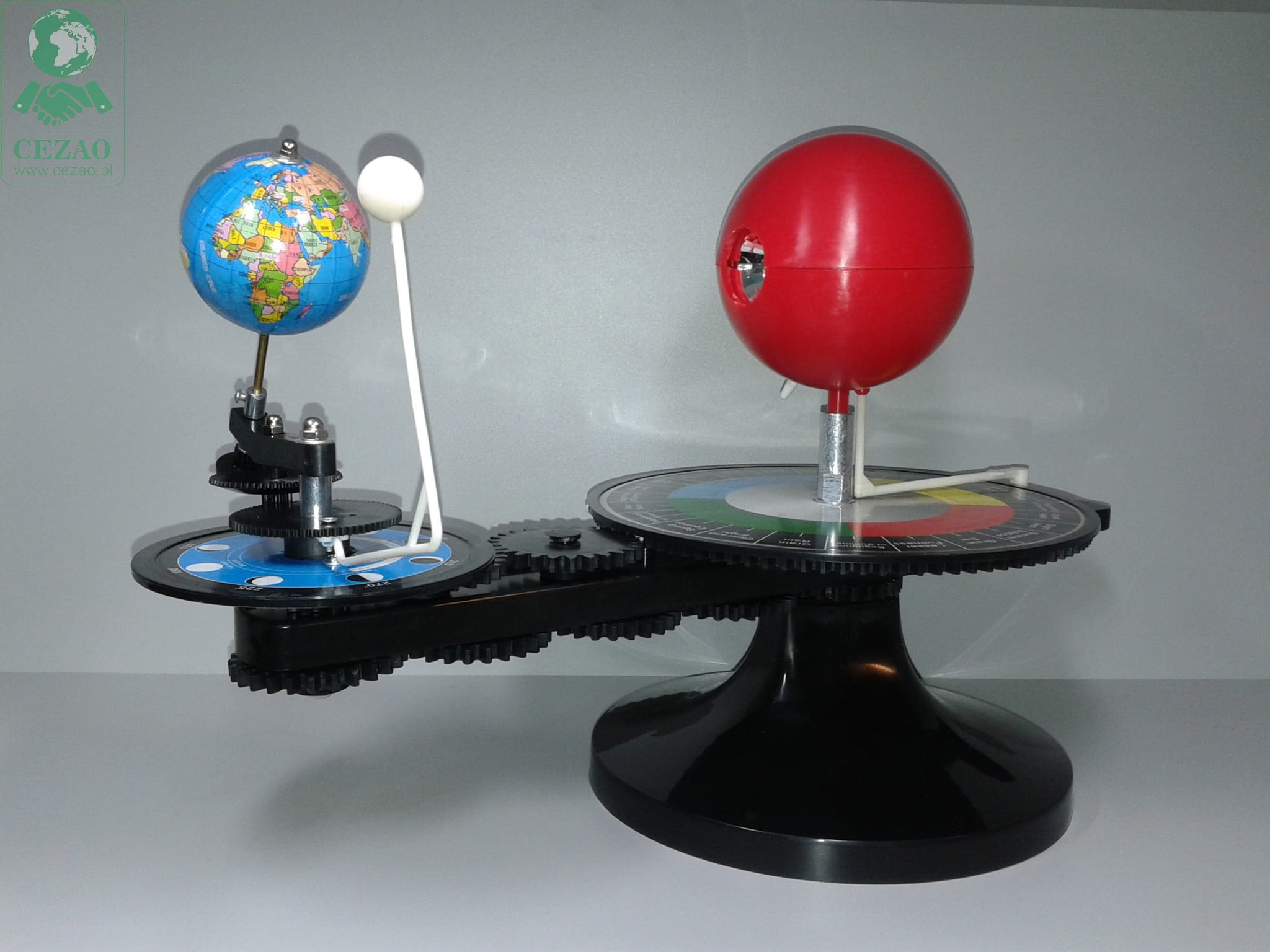 Popularny, ruchomy model wykorzystywany na lekcjach geografii i przyrody pomoże zobrazować jak w trakcie całego roku zmienia się kąt padania promieni słonecznych w układzie Słońca-Ziemia-Księzyc a więc z czego wynika istnienie pór roku, faz księżyca, zaćmień Słońca i Księżyca.