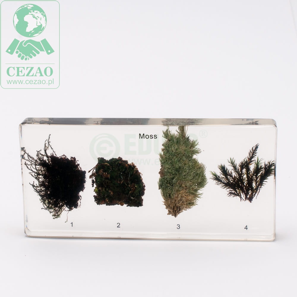 Preparat makroskopowy zatopiony w pleksi prezentuje morfologię wybranych mchów i wątrobowców (gromada ta sytuowana była dawniej jako klasa mszaków). Produkt firmy EDUKO unaocznia uczniom różnorodność morfologiczną prezentowanych gromad.