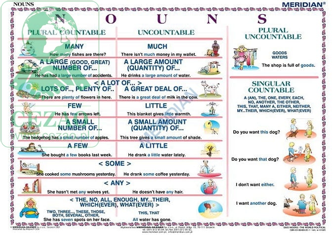 Na stronie przedstawiono wykaz określników używanych w celu określenia ilości w odniesieniu do rzeczowników policzalnych i niepoliczalnych w języku angielskim (many, a large number of, a lot of, lots of, plenty of, few, a small number of, a few, some, any, the, no, all, enough, my, their, whichever, whatever, much, a large amount of, little, a small amount of, a little, this, that, these, those, both, several, other). Każdy określnik jest użyty w zdaniu, a treść zdania jest zilustrowana kolorowym obrazkiem. Ponadto podano przykłady przedimków i zaimków odnoczących się do rzeczowników niepoliczalnych oraz dwa przykłady rzeczowników niepoliczalnych przyjmujących końcówkę liczby mnogiej rzeczowników policzalnych (goods, waters).