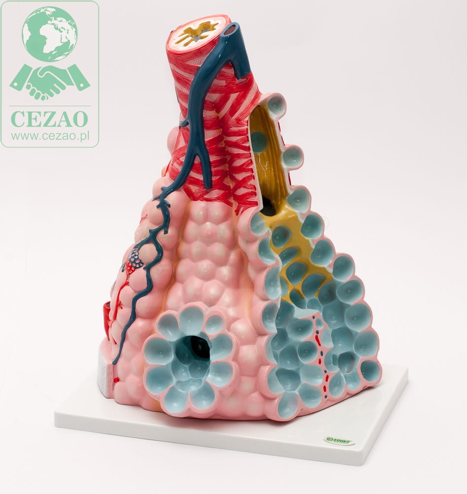 Model firmy EDUKO doskonale sprawdza się jako wyposażenie gimnazjalnej lub licealnej pracowni biologicznej. Pomoc dydaktyczna przestawie szczegóły budowy anatomicznej pęcherzyków płucnych, okrzelików, naczyń włosowatych, tętniczek i żył oplatającyh te struktury. Model o wymiarach całkowitych 35x23x45cm na stałe przytwierdzony jest do podstawy.