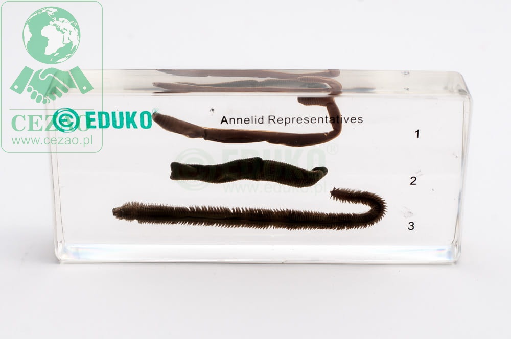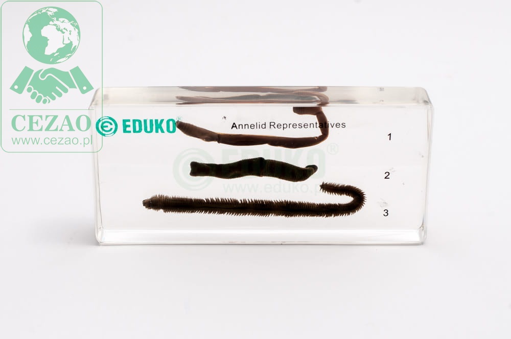 Preparat makroskopowy firmy EDUKO prezentuje wybranych przedstawicieli tradycyjnie uznanych grup pierścienic unaoczniając wspólne cechy budowy zewnętrznej tych zwierząt: podział ciała na segmenty (metamery) tworzące część głowową i tułowiową, wyodrębnienie członów gębowego i przedgębowego z części głowowej oraz wydłużony kształt ciała.