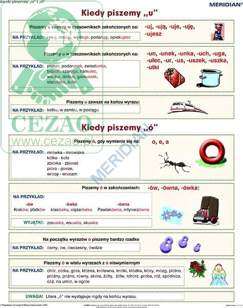 Ścienna plansza szkolna do języka polskiego przedstawiająca zasady pisowni wyrazów z „ó” i „u”. Pomoc dydaktyczna wspomagająca nauczanie ortografii. Czytelna konstrukcja, odpowiednio dobrane przykłady i ilustracje pozwalają w łatwiejszy sposób przyswoić zawiłe reguły polskiej ortografii.