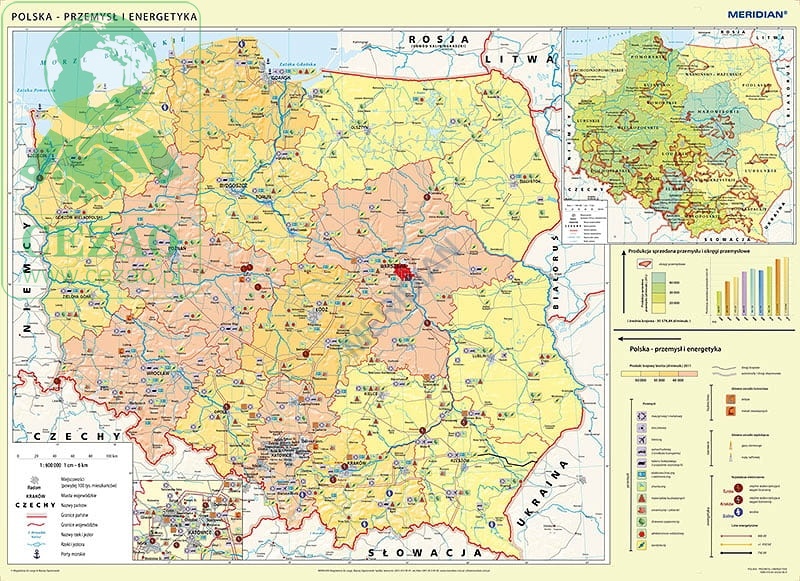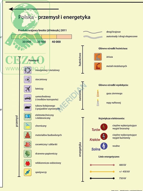 Ścienna mapa szkolna przedstawiająca nowoczesne i najbardziej aktualne ujęcie różnorodnych zagadnień z geografii gospodarczej Polski. Mapa główna, na podkładzie kartogramu PKB (zł/mieszk.), ukazuje rozmieszczenie głównych ośrodków poszczególnych gałęzi przemysłu. Dodatkowo powiązane jest to ze strukturą sieci energetycznej, czyli lokalizacjami najważniejszych elektrowni (z podziałem na rodzaje) oraz przebiegiem sieci najwyższych napięć.