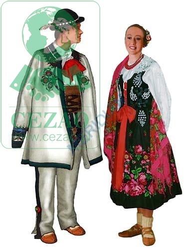 Komplet 10 plansz przedstawiających polskie stroje ludowe.