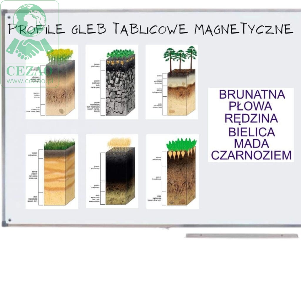 Profile gleb tablicowe magnetyczne Profile gleb tablicowe magnetyczne to doskonały produkt dla uczniów szkół, który wprowadza fascynujący świat gleb w sposób interaktywny i edukacyjny. Ten produkt pomaga uczniom lepiej zrozumieć różnorodność gleb i umożliwia im naukę poprzez zabawę. Główne cechy produktu: Wizualna reprezentacja gleb: „Profile gleb tablicowe magnetyczne” prezentują różne rodzaje gleb w atrakcyjny i przystępny sposób. Każdy profil glebowy jest wyraźnie ilustrowany i pokazuje charakterystyczne cechy danej gleby, takie jak kolor, tekstura, i skład mineralny. Magnetyczna tablica interaktywna: Uczniowie mogą eksperymentować z profilami gleb, przemieszczać je na magnetycznej tablicy, tworzyć własne zestawienia i analizować zmiany. To pozwala na aktywne uczenie się i eksplorację gleb. Przyporządkowanie nazw: Produkt umożliwia uczniom przyporządkowanie odpowiednich nazw do każdego profilu glebowego. To doskonały sposób na rozwijanie ich umiejętności rozpoznawania różnych gleb i nabywanie wiedzy w sposób praktyczny. Edukacyjne zastosowanie: „Profile gleb tablicowe magnetyczne” mogą być używane w ramach lekcji geografii, biologii, czy ekologii, aby nauczyć uczniów o roli gleb w przyrodzie i rolnictwie. Mogą również służyć jako narzędzie do prowadzenia eksperymentów i analizy gleb w szkolnych laboratoriach. Zwiększenie zaangażowania: Dzięki interaktywnemu charakterowi produktu, uczniowie są bardziej zaangażowani w proces nauki. Manipulowanie profilami gleb i przyporządkowywanie nazw stwarza okazję do rozwijania umiejętności problem-solving i logicznego myślenia. Zasób dydaktyczny: Produkt może być wykorzystywany zarówno przez nauczycieli, jak i uczniów jako cenny zasób dydaktyczny, który ułatwia zrozumienie i pamiętanie informacji o glebach. „Profile gleb tablicowe magnetyczne” to doskonały sposób na wzbogacenie procesu edukacyjnego, zachęcając uczniów do aktywnego uczenia się i zrozumienia znaczenia gleb w ekosystemie. Każdy profil ma wymiar A3, czyli: 30 × 40 cm. Z tyłu zaopatrzony jest w magnesy umożliwiające prezentację na tablicy. Dodatkowo do każdego profilu jest magnetyczna nazwa.