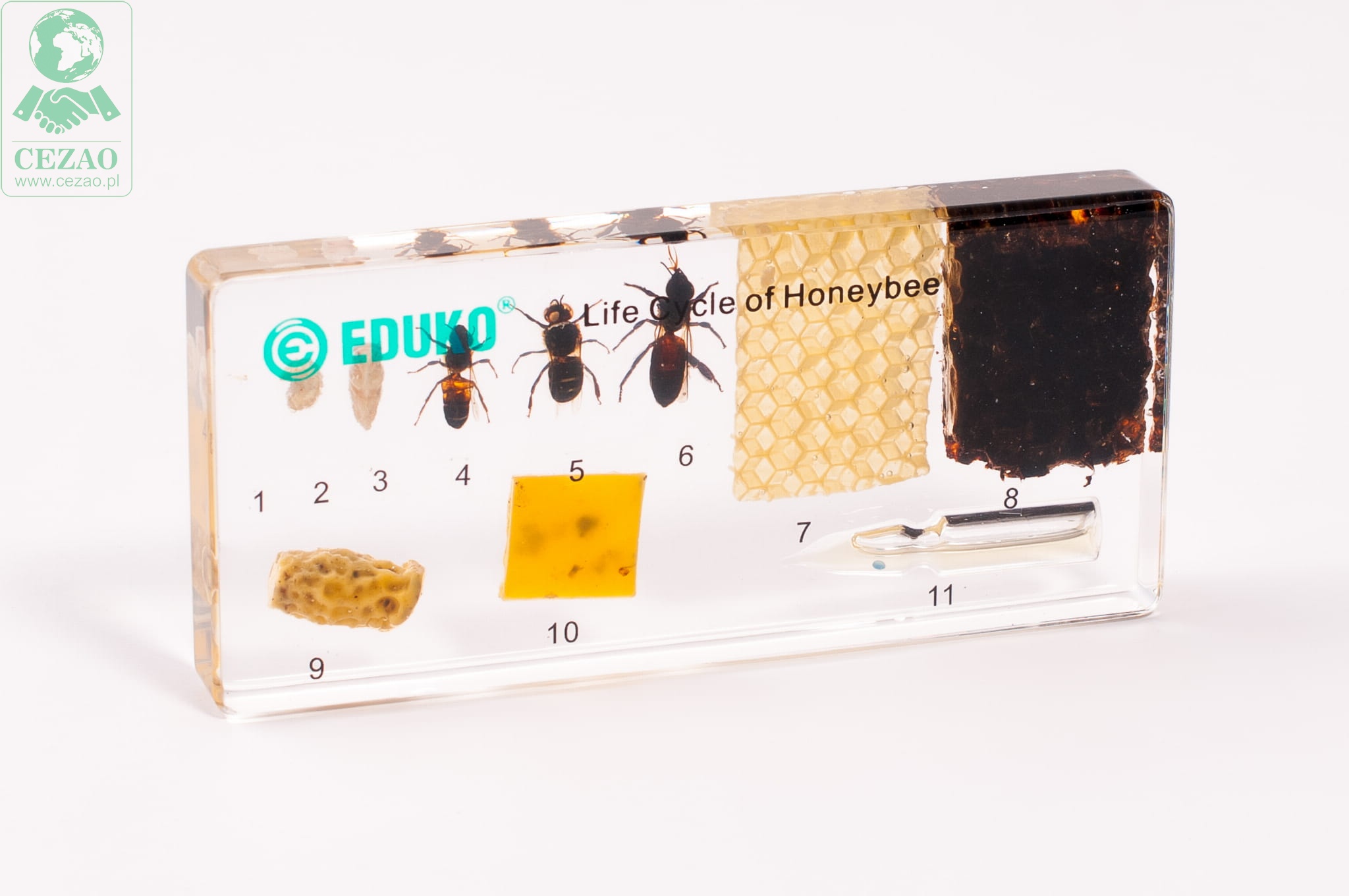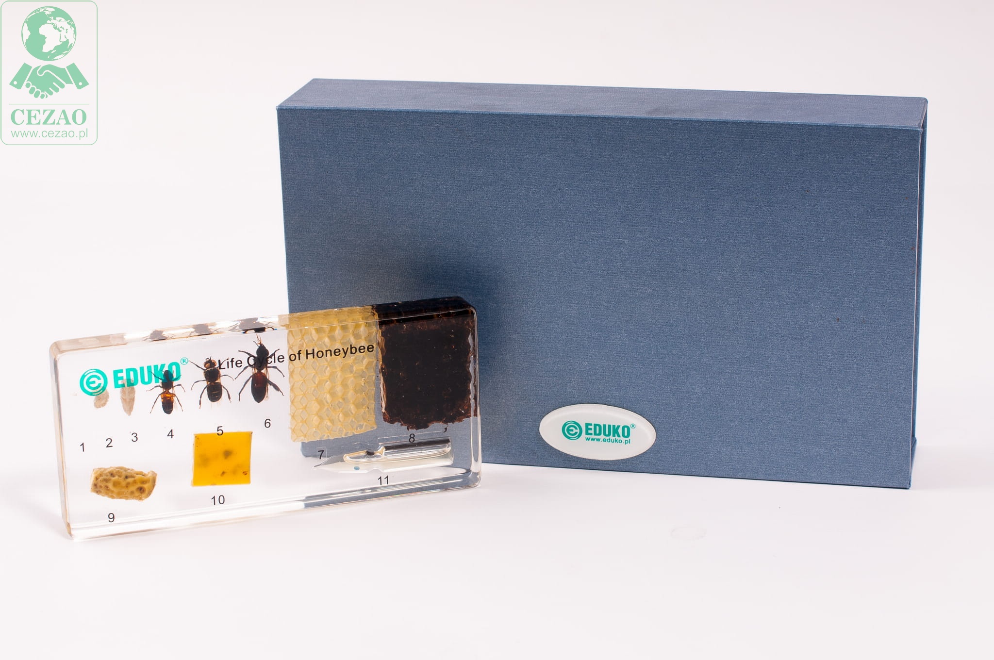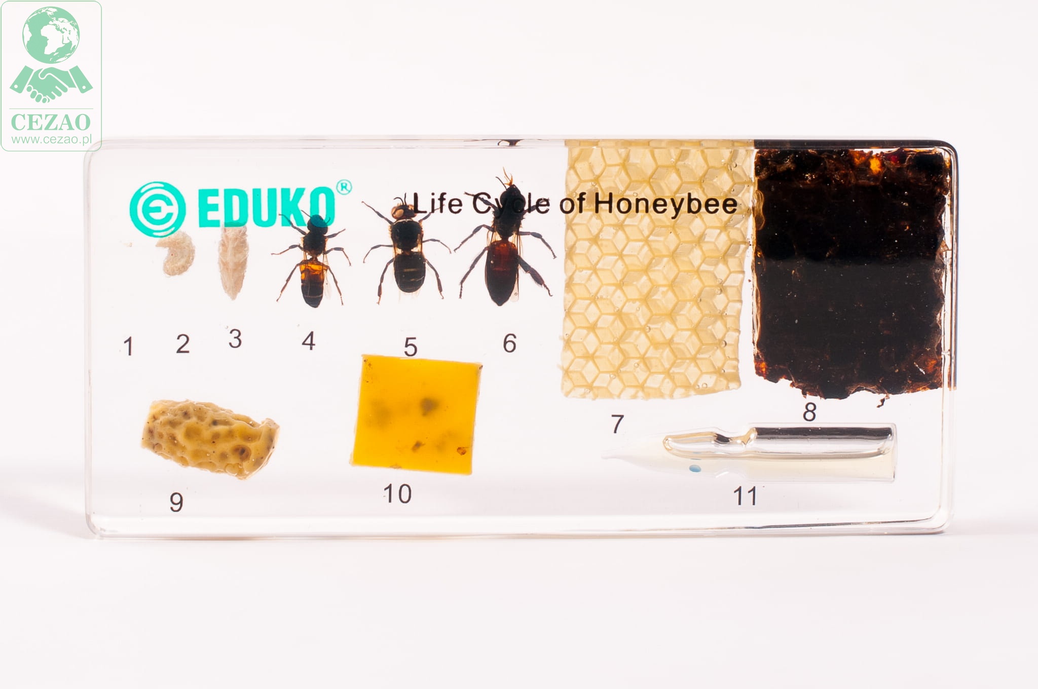 Preparat firmy EDUKO prezentuje dymorfizm między pszczołami pełniącymi różne funkcje w ulu, etapy rozwoju owada od jaja do osobnika dorosłego oraz pożytki pszczelarskie. Zestaw ten umożliwi uczniom bezpieczne obejrzenie pszczół w różnych stadiach rozwoju i zapoznanie się z dymorfizmem płciowym i funkcjonalnym u tych owadów społecznych. Przejrzyste tworzywo, w których zalane zostały okazy pozwala na wnikliwą obserwację, jest bezpieczne dla ucznia i zwiększa trwałość preparatu.