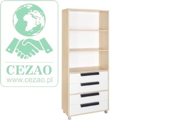 Fronty regału wykonanao z białej płyty, natomiast korpus występuje w kolorach: buk, olcha, klon, modrzew.